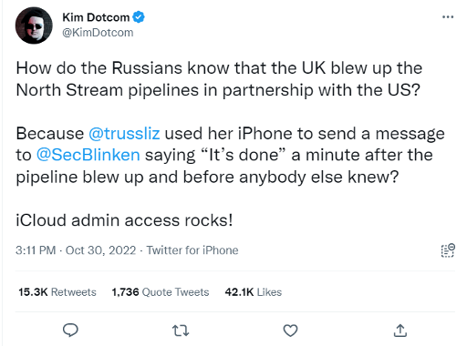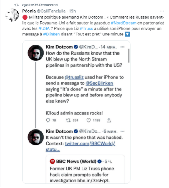 A further unsubstantiated claim emerged, claiming that the evidence for the Russian accusation of UK involvement in Nord Stream was a leaked text from then UK Prime Minister Liz Truss to US Secretary of State Antony Blinken saying “It’s done”, a message supposedly discovered in the wake of the confirmed hacking of the PM’s phone by Kremlin-aligned actors. The claim seems to have originated from KimDotcom, an internet entrepreneur and conspiracy theorist.