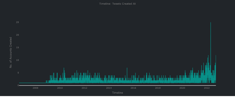Closer inspection of accounts that mentioned “Biden” and “Nordstream”, and those that mentioned “Truss” and “Nordstream”, showed an incredible degree of consistency, suggesting a coordinated promotion of specific posts. Of 40 accounts that mentioned these keyword pairs, 33 of them resembled the bots from earlier in the month, promoting conspiracy accounts from the same pool of tweets. And for the accounts most active on the topic of “Truss” and Nordstream” there was a cut-off point of four tweets for accounts with conventional bot behaviour, resembling earlier activity in which suspected bot accounts would limit the number of posts on the topic within the timeframe.