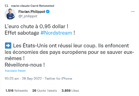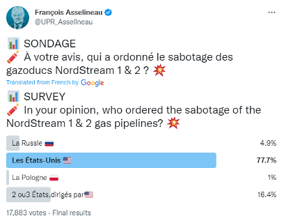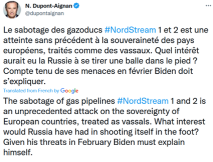 For combinations of the terms “Nordstream”, “Biden”, and “Sabotage”, most of the posts were in French, with several of the highest-profile tweets coming from French-speaking anti-American politicians. Francois Asselineau of the (anti-American) Popular Republican Union posted a poll creating an illusion of popular belief in US responsibility for the pipeline damage, and French politician Nicolas Dupont-Aignan, the Eurosceptic and nationalist leader of the minor right-wing party Debout la France, also posted a tweet hinting at Biden involvement.