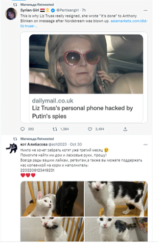 However, this allegation spread further than French-speaking Twitter. The highest-engagement tweet between 29 October (when the Truss hacking story broke) and 31 October was an English-language tweet from a pro-Russian verified account, and other unusual forms of engagement included a retweet from an account that otherwise posted exclusively in Russian.