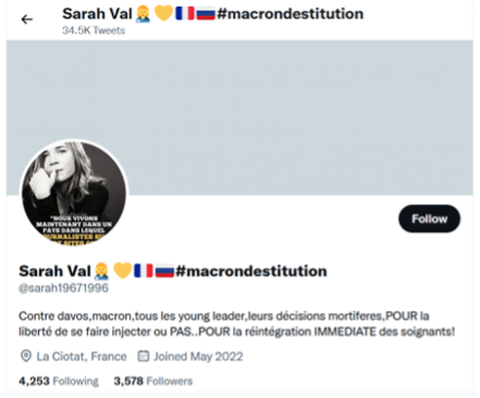 Dupont-Aignan’s tweet, posted on 29 September to his 350,000 followers, was retweeted numerous times. There are signs that much of the retweeting activity was from tactical or bot accounts: most of the retweets were in the hours immediately following the tweet’s initial publication, and of the 12 accounts with over 10,000 followers that retweeted it, not one was a verified account. They include a French politician who visited Crimea after the annexation, a Haitian meme account, and a Quebecois actress turned Covid conspiracy theorist.