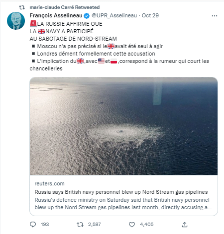 Our analysis of Twitter activity in the aftermath of the recent Nord Stream gas leaks points to the coordinated promotion of posts (including the use of bots), largely from within the French-speaking world, to retweet unsubstantiated claims and disinformation implicating the US and the UK. The pattern of behaviour is consistent with bot activity: tweets outlining conspiracies that favour Russia were repeatedly posted by relatively well-known fringe figures, after which suspected bots would retweet these original tweets a specified number of times. These findings are further validated by the emergence of a similar pattern of activity when the narrative of the accusations shifted from the USA to the UK.